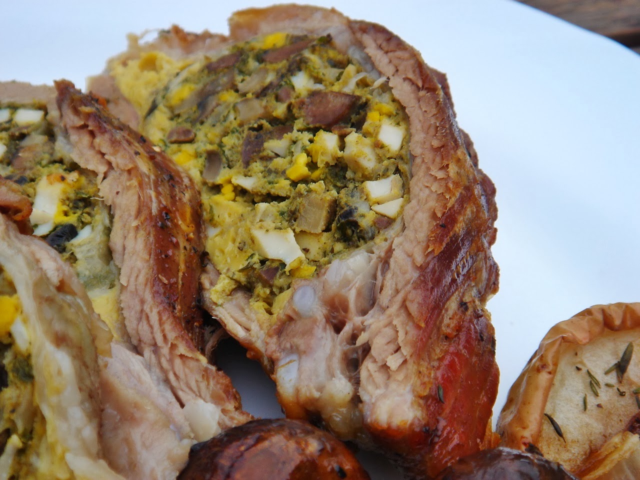 Hagytam hűlni a tölteléket és a tojásvágóval két irányból is – rusztikusra – összevágott kemény tojásokat elkevertem a tojássárgájával, majd a felvert tojásfehérjével. Beletöltöttem a pácolt dagadóba és bevarrtam a végét.