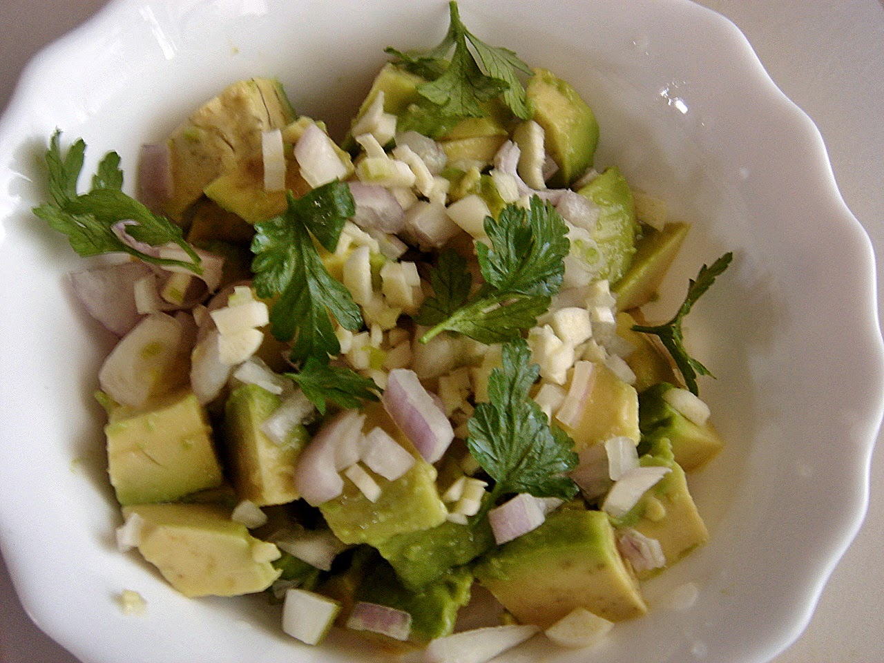 Az avokádó húsát felkockáztam és meglocsoltam fél lime levével. Ezt érdemes mielőbb megtenni, hogy nehogy bebarnuljon. Óvatosan elkevertem a salottával, fokhagymával, petrezselyemlevéllel, majd nagyon enyhén sóztam.