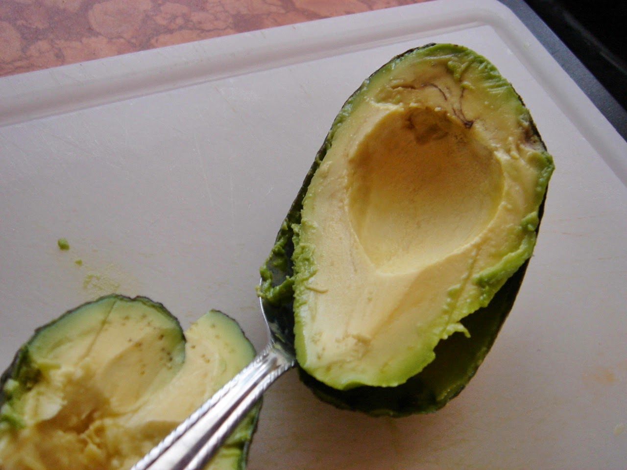 Az avokádót hosszanti irányban végig bevágtam a magjáig. Az egyik felét „lepattintottam”, a másik felében maradt magot kiszedtem (ha kést szúrunk a magba, akkor azzal könnyedén ki tudjuk emelni), majd kanállal, egyben kivájtam a húsát mindkét feléből.