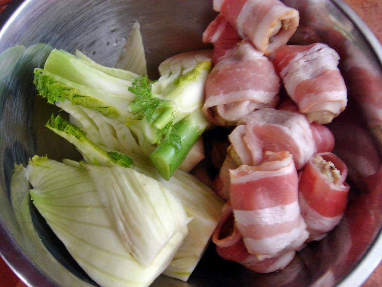 Közben sóztam, borsoztam a máj darabokat és egy-egy fél csík baconbe csomagoltam. Az édesköményt hosszában 6 darabra vágtam.