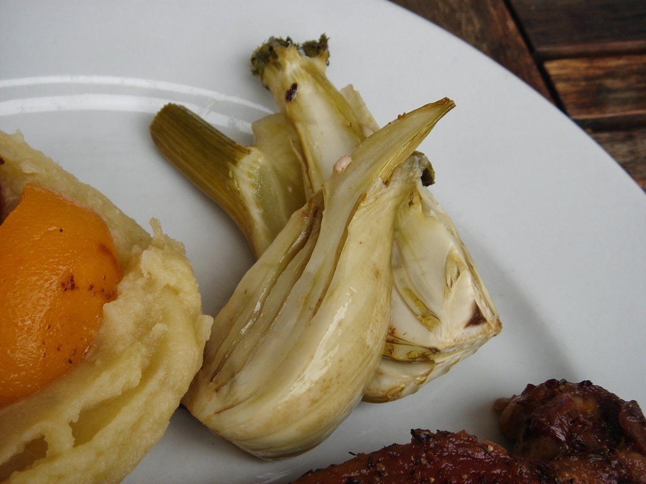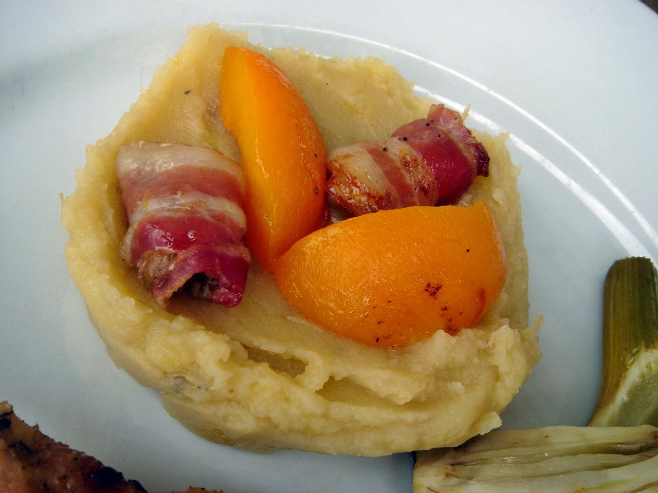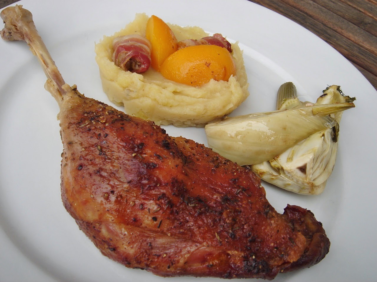 Kivettem a krumplikat a sütő aljából majd a cserépedényt a combokkal. A hőt 200 C fokra feltekertem. Leöntöttem a pecsenyeszaft 90 %-át, kivettem a héjas fokhagymákat, és elrendeztem az édeskömény és barack darabokat a combok mellé, majd felülre a göngyölt májakat.