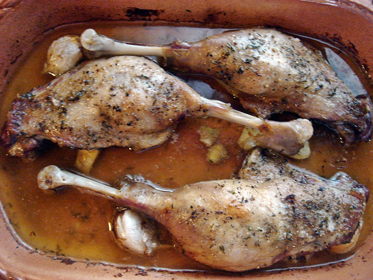 230 C fokra befűtöttem a sütőt. Libazsírral kikentem a cserépedényt, visszahelyeztem bele a pácolt libacombokat és betoltam a forró sütőbe. 5-6 perc múlva 130 C fokra mérsékeltem a hőt és a combok alá dugdostam a szeletelt fokhagymát, a héjas fokhagymát pedig mellészórtam. 2 órán keresztül sütöttem a libacombokat ezen az alacsony hőmérsékleten. Akár le is fedhetjük, ha izmosnak gondoljuk őket.