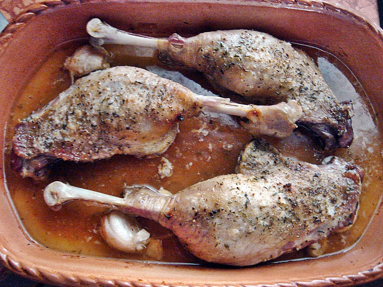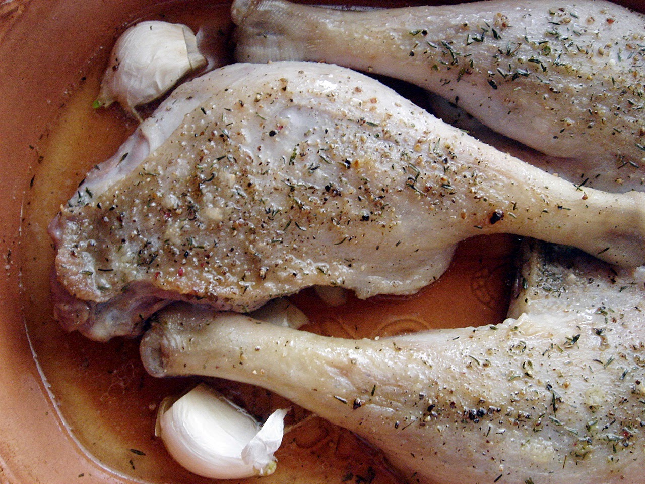 A műsor előző este indult, amikor is megszórtam Maldon sóvirággal az alaposan tisztított combokat, majd frissen őrölt borssal és morzsolt kakukkfűvel. A cserépbe rendeztem, amiben süti kívántam őket, lezártam folpackkal és betettem a hűtőbe.