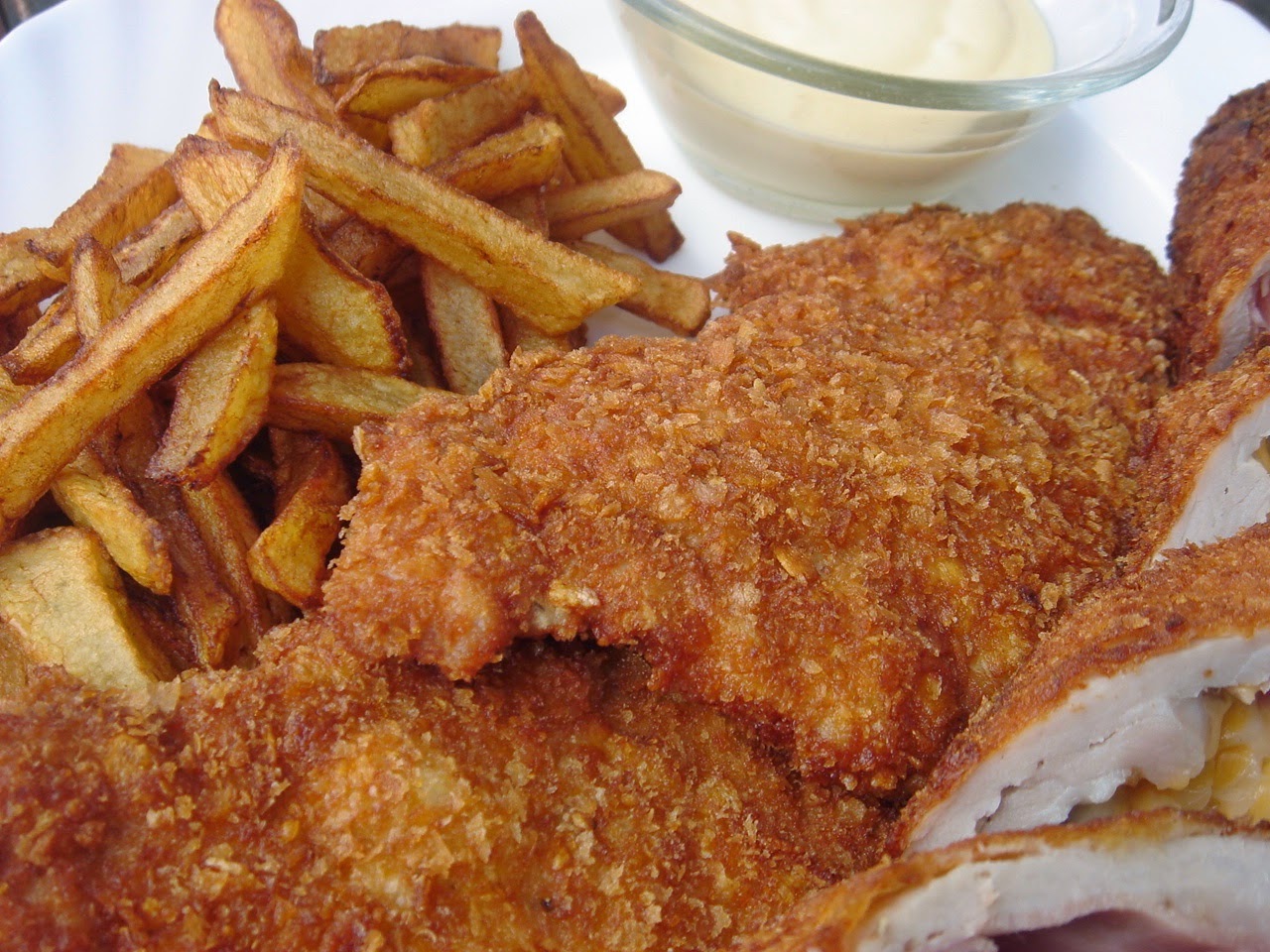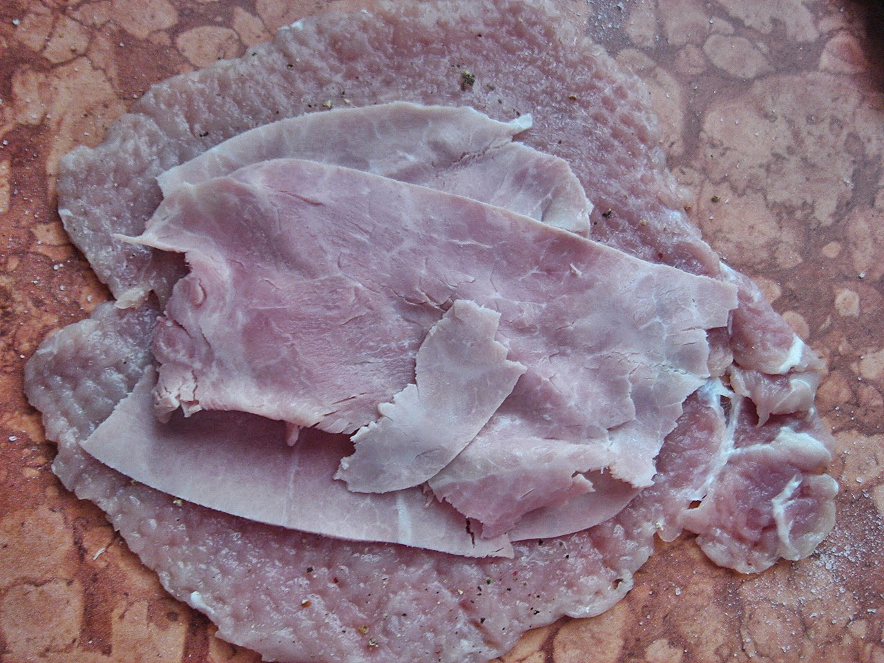A karaj szeleteket sóztam, borsoztam, néhány milliméterrel a két szelet szélét fedésbe hoztam, lefektettem rá a sonkát és közepére halmoztam a sajtkeveréket és egyszerűen felgöngyöltem, a széleket csúcsosra. Liszt, csipet sóval fűszerezett felvert tojás, házi morzsa sorrendben paníroztam.