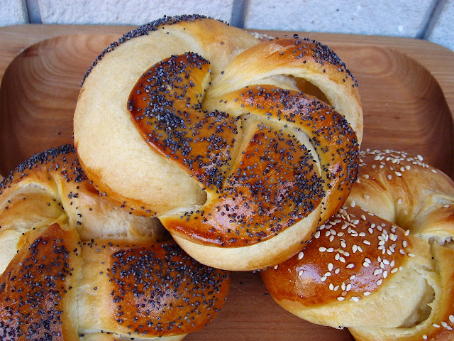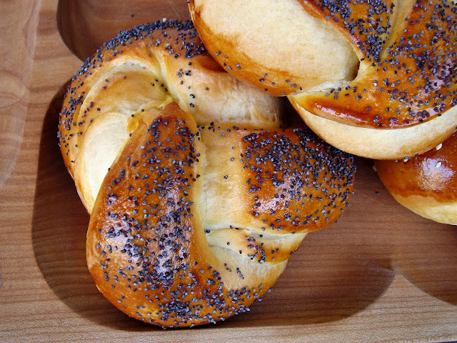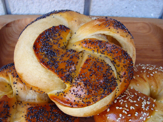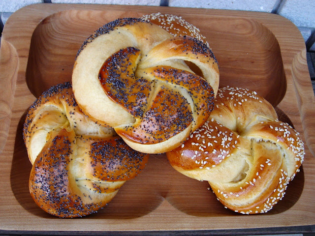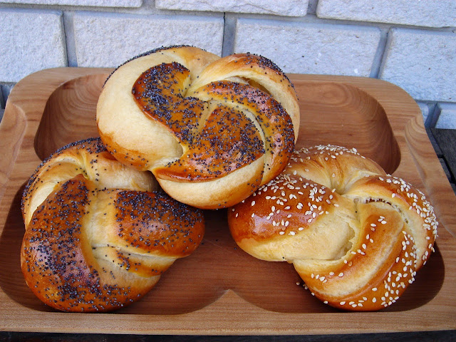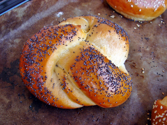 A zsemléket a tojással megkentem, megszórtam a magvakkal és 17 perc alatt arany barnára sütöttem. Rácson hagytam hűlni jó félórán át, mielőtt megvágtam.